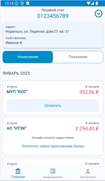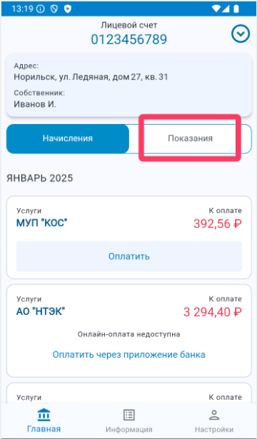 - «Показания», где доступна для просмотра информация об установленных в помещении индивидуальных приборов учета, в том числе история переданных показаний и даты следующих поверок. Также можно передавать показания индивидуальных приборов учета в период с 1-го по 22-е число до 17:00 по норильскому времени.