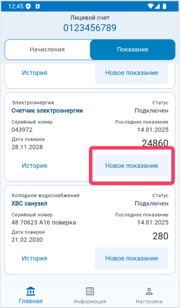 Показания необходимо передавать отдельно по каждому индивидуальному прибору учета. Выберите прибор учета и нажмите кнопку «Новое показание»