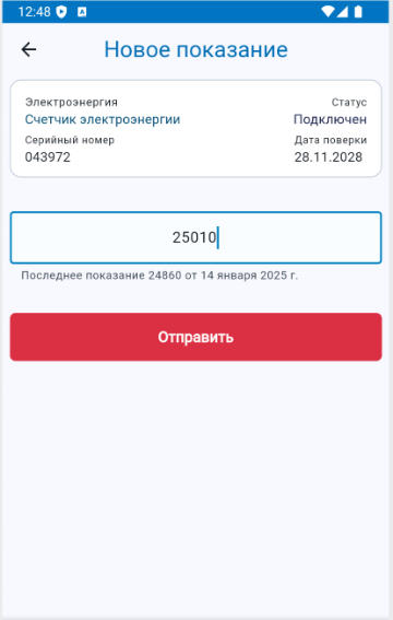На экране «Новое показание» введите соответствующие показания в поле ввода и нажмите кнопку «Передать»
