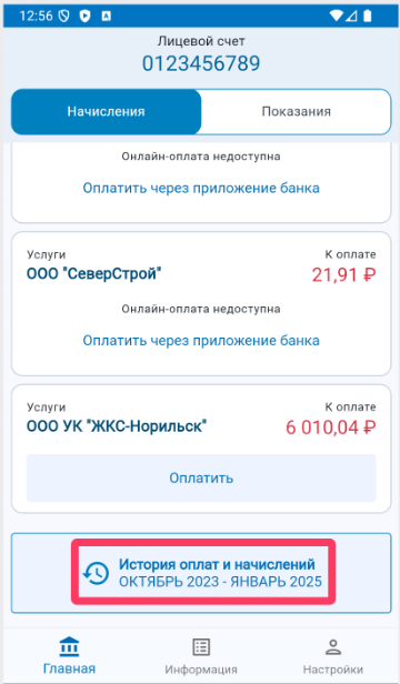 В нижней части вкладки «Начисления» нажмите кнопку «История оплат и начислений»
