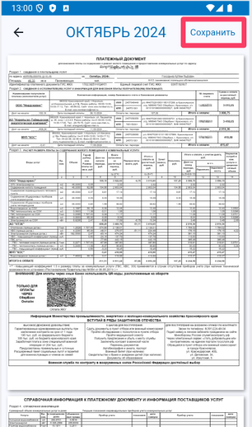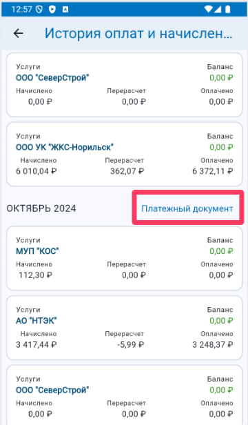 По экране «История оплат и начислений» отображается информация о прошлых расчетных периодах.Для того, чтобы просмотреть единый платежный документ нажмите на кнопку «Платежный документ» рядом с наименованием расчетного периода.