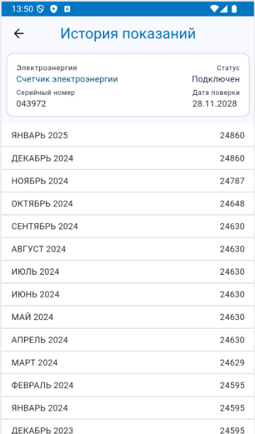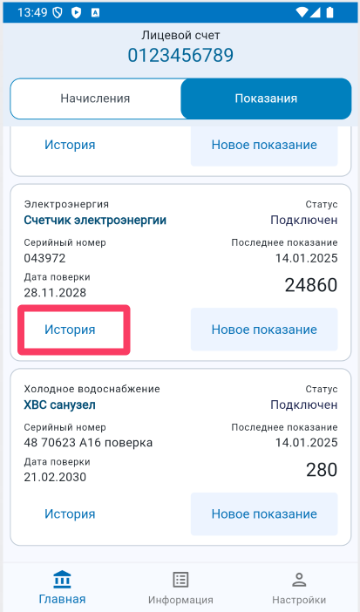 Для просмотра истории показаний выберите прибор учета и нажмите кнопку «История»